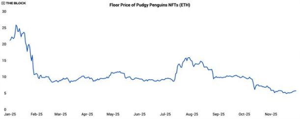 與此同時,其生態(tài)代幣 PENGU 的表現(xiàn)也不佳,年內(nèi)跌幅約 60%,但相比 NFT 本身仍略好一些。這表明,對于希望投資 Pudgy 品牌的投資者而言,代幣可能已成為更便捷、流動性更好的投資工具,盡管其經(jīng)濟模型并不直接與商品銷售或媒體收入掛鉤。