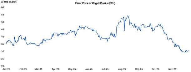 即使在沉寂的一年里,CryptoPunks 也曾引發(fā)一波短暫關(guān)注。該系列底價在 2025 年 7 月至 8 月間上漲約 40%,于 7 月中旬達到約 54 ETH 的峰值。但此后,其價格近乎腰斬,截至報告撰寫時已回落至 30 ETH 附近。