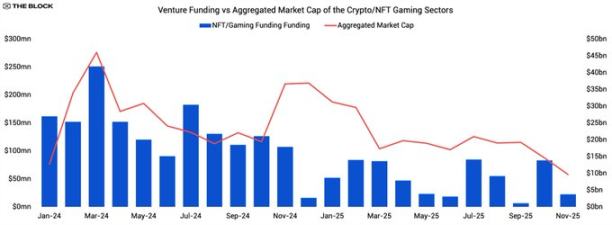 盡管速度放緩,風(fēng)險投資仍在繼續(xù)為 NFT 和 GameFi 項目注資,但 2025 年該領(lǐng)域的年度融資額僅為 10 億美元左右,較 2024 年下降約 65%。與此同時,NFT/ 游戲類代幣的總市值年內(nèi)跌幅超過 60%,這既是價格下跌的結(jié)果,也反映了眾多上線項目的表現(xiàn)不佳。