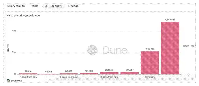 據(jù) Dune Analytics 鏈上數(shù)據(jù)監(jiān)測,Kaito 當前正處在一個高度敏感的流動性窗口期。大量質押代幣已進入解質押冷卻隊列,短期內(nèi)可能集中流入二級市場,疊加后續(xù)解鎖節(jié)點,項目或將面臨持續(xù)性的拋壓考驗。