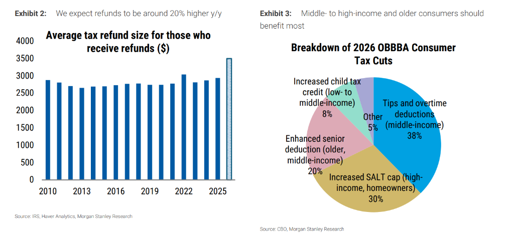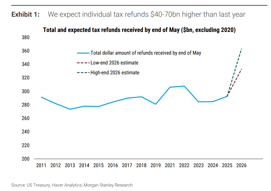 - 關(guān)鍵數(shù)據(jù): 摩根士丹利預(yù)計,今年的個人退稅額將比去年高出400億至700億美元。如果收到退稅的消費者數(shù)量保持不變,平均退稅規(guī)模將增加550美元,達(dá)到約3500美元的歷史高位。