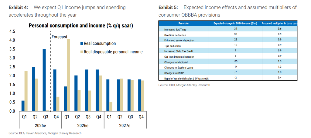 模型預(yù)測: 摩根士丹利預(yù)計該法案僅能將今年的實際消費提振20個基點(對GDP的整體影響約為40個基點)。