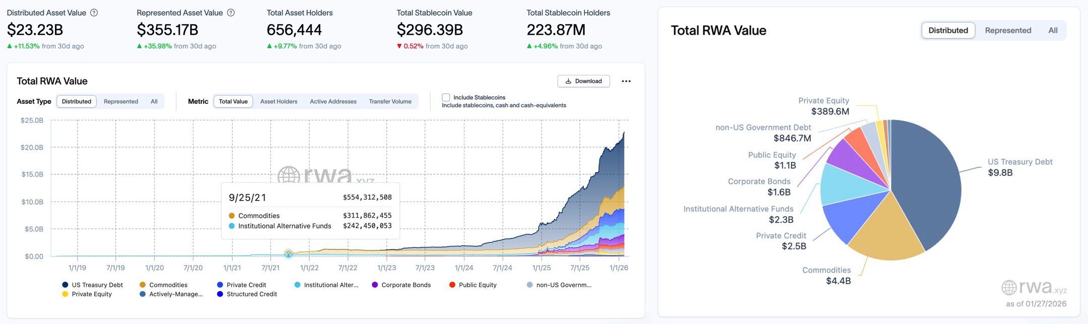 據(jù) rwa.xyz 數(shù)據(jù)面板,截至 2026 年 1 月 27 日,RWA 鏈上總價值(Distributed Asset Value)繼續(xù)穩(wěn)步上漲,由 1 月 20 日的 216.6 億美元增長至 232.3 億美元,單周增幅為 7.6 億美元,漲幅為 3.51%。廣義 RWA 市場的體量也出現(xiàn)了顯著反彈,從 3500.8 億美元回升至 3550.8 億美元,增加 50 億美元,漲幅為 1.43%。資產(chǎn)持有者的總數(shù)從 637,807 人增加至 656,444 人,單周凈增 18,637 人,增幅為 2.92%。與此同時,穩(wěn)定幣市場保持了相對平穩(wěn)的增長,持有者數(shù)量從 2.2334 億人增長至 2.2387 億人,增幅 0.23%;穩(wěn)定幣市值輕微上升,由 2996.4 億美元增加至 2999.64 億美元,漲幅為 0.1%。