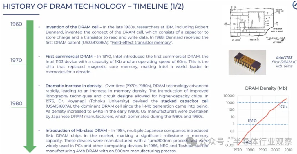 1970年,英特爾推出1103芯片,這是全球首款商業(yè)成功的DRAM產(chǎn)品,憑借在價格、密度和邏輯兼容性上對磁芯存儲器的全面超越,迅速改寫了存儲行業(yè)的格局。