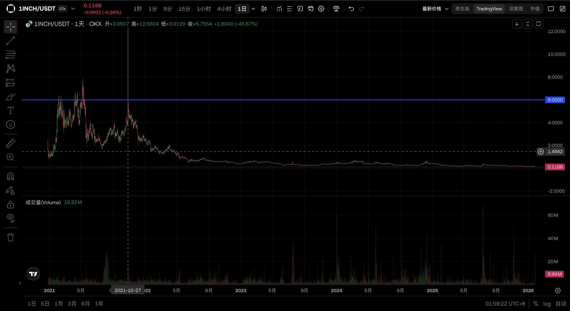然而,即便最終被證明是一場誤讀,這次賣出對 1INCH 本就持續(xù)走弱的價格而言,依然構成了現(xiàn)實層面的二次沖擊。自上一輪周期高點6 美元起,1INCH 已經(jīng)歷了長期的單邊下行,如今徘徊在0.11 美元附近。