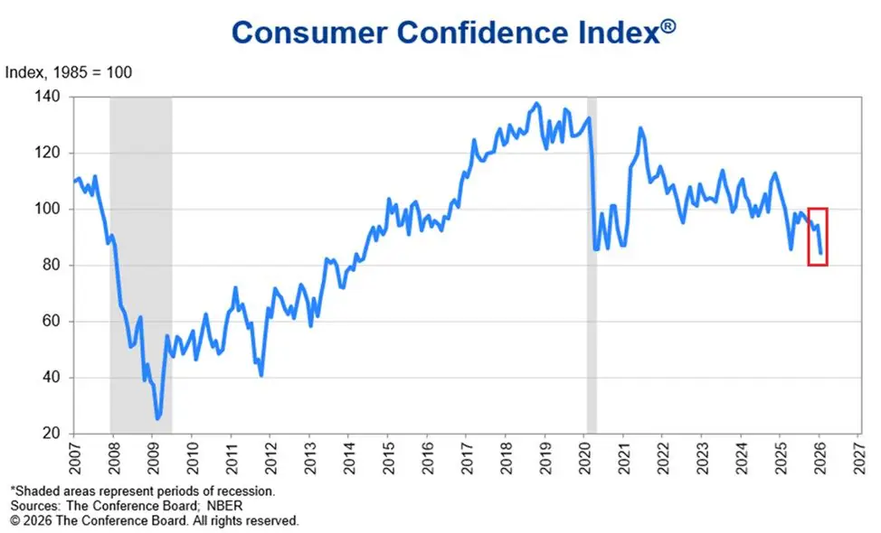 1月份消費者信心指數(shù)下降9.7點至84.5,連續(xù)第六個月下滑,創(chuàng)下2014年5月以來的最低水平。該指數(shù)目前已正式低于2020年疫情沖擊期間的水平,凸顯了消費者信心的嚴重惡化。