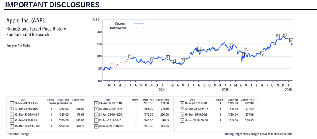 花旗維持買入評(píng)級(jí),目標(biāo)價(jià)315美元。據(jù)花旗報(bào)告,目標(biāo)價(jià)基于2027年每股收益預(yù)期的33倍市盈率,較蘋果歷史水平溢價(jià)約20%?;ㄆ煺J(rèn)為,溢價(jià)是合理的,反映了不含關(guān)稅影響的毛利率擴(kuò)張、服務(wù)銷售占比增長(zhǎng)、Apple Intelligence逐步采用以及強(qiáng)勁的資產(chǎn)負(fù)債表。