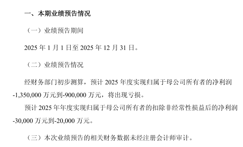根據(jù)公司1月31日披露的業(yè)績預(yù)告,2025年歸屬于母公司所有者的凈利潤預(yù)計為-90億元至-135億元。這一預(yù)測虧損額較2024年同期28.33億元的虧損幅度擴大。