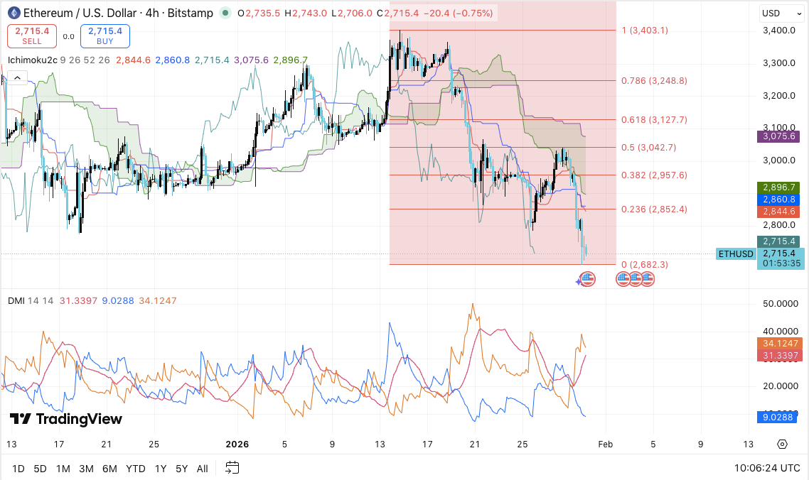 以太坊短期交易持續(xù)承壓,技術(shù)指標(biāo)、衍生品數(shù)據(jù)和現(xiàn)貨交易流向均顯示市場態(tài)度謹慎。在4小時圖上,ETH/USD在跌破關(guān)鍵斐波那契支撐位后,結(jié)構(gòu)性疲軟。除了圖表信號外,以太坊管理層近期披露的信息也為市場增添了新的關(guān)注點。