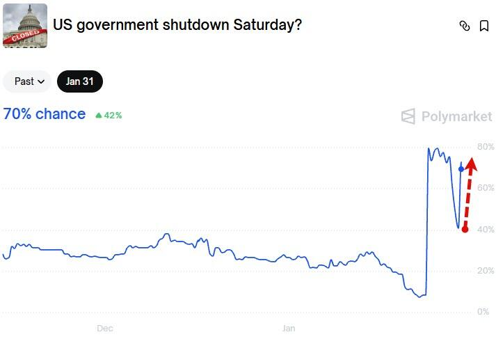 盡管已獲得總統(tǒng)特朗普的公開(kāi)背書(shū),一份旨在避免美國(guó)政府部分停擺的兩黨支出協(xié)議在周四深夜遭遇阻礙,導(dǎo)致預(yù)測(cè)市場(chǎng)暗示的政府停擺概率飆升至70%。