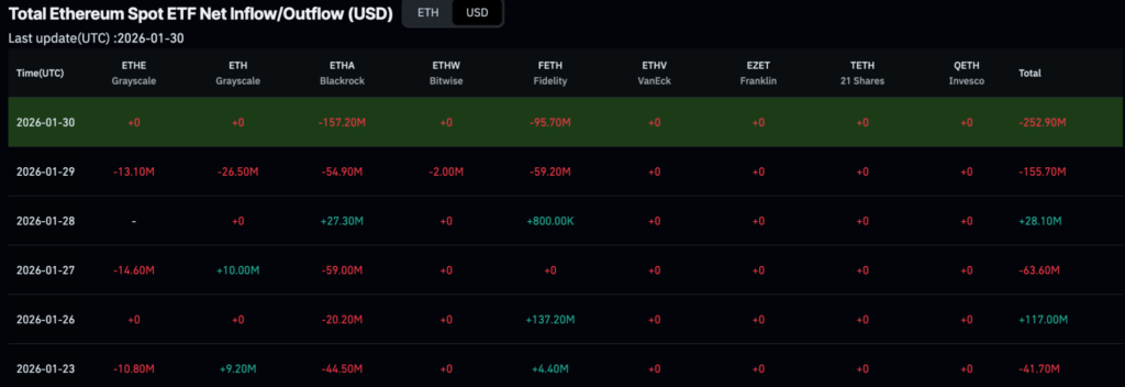 以太坊也呈現(xiàn)出類似的趨勢,盡管規(guī)模較小。ETHA 在一周內(nèi)持續(xù)遭到拋售,最終在 1 月 30 日達到 1.57 億美元的巨額資金流出,此前一天其市值已蒸發(fā)近 5500 萬美元。