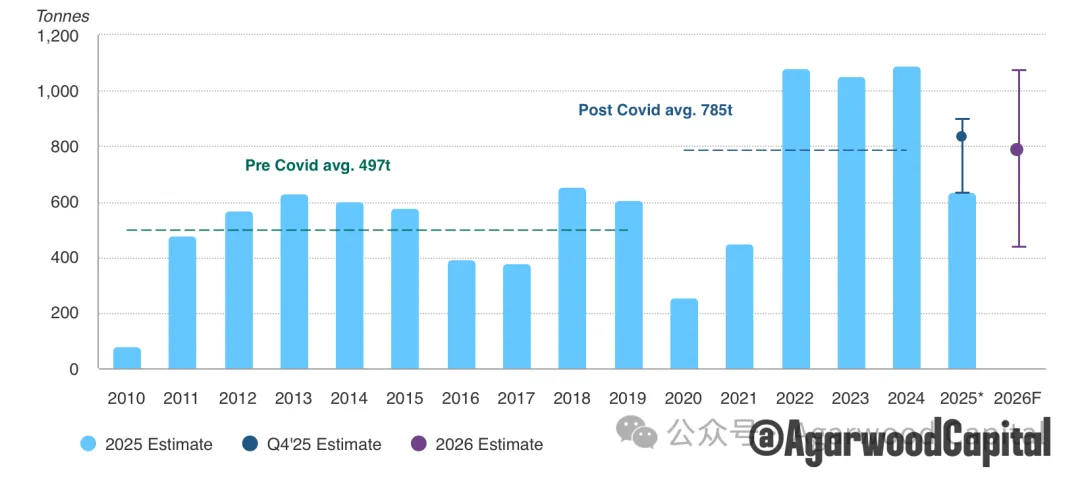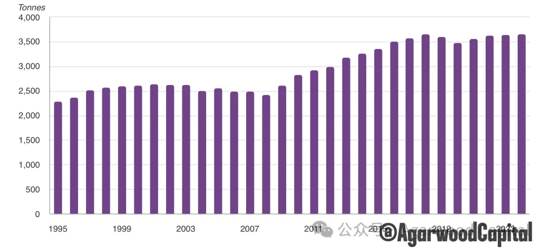 ? 其中礦產(chǎn)供應(yīng)約 3,660–3,670 噸,較 2018 年的前一高點(diǎn)僅高出幾噸,顯示礦產(chǎn)產(chǎn)量近年基本處于平臺區(qū)