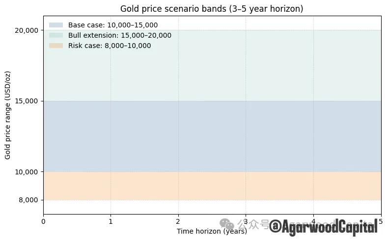 在央行持續(xù)增持、美元秩序風(fēng)險(xiǎn)未解、供給端增長有限的組合下,黃金未來三到五年很可能維持在一個底部不斷抬高,歷史新高不斷的通道內(nèi),基準(zhǔn)情境下,我們認(rèn)為價格能漲到10,000美元以上,若出現(xiàn)更嚴(yán)重的地緣政治、貨幣與秩序沖擊,向 15,000-20,000美元區(qū)間測試的概率需要被納入情境規(guī)劃。
