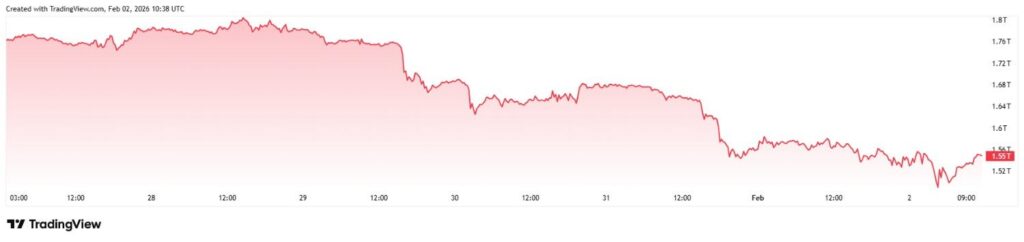 短短一周內(nèi),總數(shù)加密貨幣市場(chǎng)根據(jù) Finbold 計(jì)算的數(shù)據(jù),截至 2026 年 2 月 2 日發(fā)稿時(shí),全球市值縮水約 4000 億美元,從約 2.95 萬億美元降至約 2.56 萬億美元。