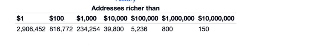 截至2026年2月2日,數(shù)量為百萬富翁的地址已經(jīng)消失了到 950 個(gè)錢包中,有 800 個(gè)錢包的金額在 100 萬美元到 999 萬美元之間,有 150 個(gè)地址的金額超過 1000 萬美元。