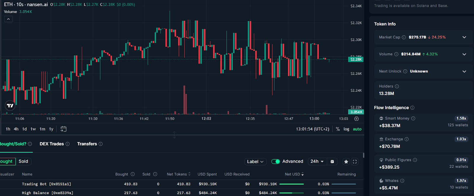 據加密情報平臺Nansen數(shù)據顯示,過去一周,“聰明錢”交易者買入3830萬美元現(xiàn)貨ETH,巨鯨購入547萬美元,新錢包買入3100萬美元。