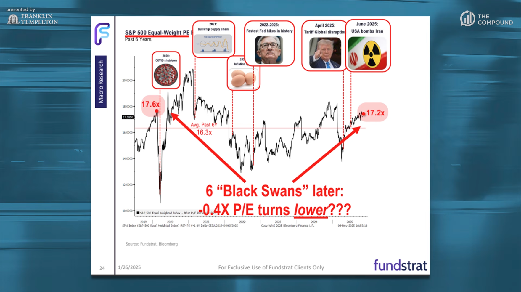 Josh Brown:關(guān)于市場(chǎng)整體表現(xiàn),這張圖表顯示,自 2019 年底以來(lái),市場(chǎng)經(jīng)歷了六次重大沖擊。雖然“黑天鵝事件”這個(gè)詞可能有些夸張,但這些事件確實(shí)對(duì)市場(chǎng)造成了影響,包括 COVID 疫情封鎖、供應(yīng)鏈問(wèn)題、通貨膨脹、歷史上最快的美聯(lián)儲(chǔ)加息、關(guān)稅政策,以及美國(guó)轟炸伊朗。那么這個(gè)圖表想要傳遞什么信息?當(dāng)你將市場(chǎng)估值與這些事件放在一起時(shí),你希望告訴大家什么?