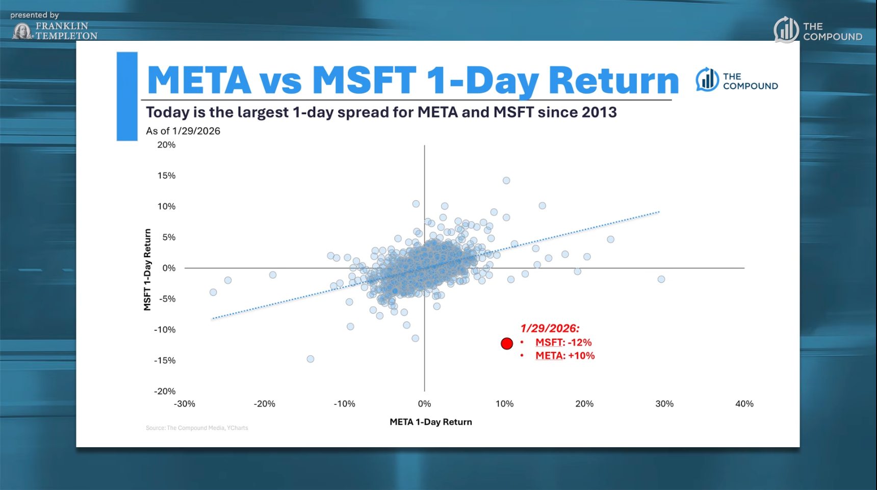 Microsoft 的股價(jià)下跌了 12%,而 Meta 的股價(jià)卻上漲了 10%。這些公司過(guò)去通常會(huì)朝同一個(gè)方向波動(dòng),但今天的情況卻完全不同。而且有趣的是,這兩家公司昨天都發(fā)布了財(cái)報(bào),并且都提到了資本支出的問(wèn)題。市場(chǎng)似乎對(duì) Microsoft 的 45% 未完成訂單與 OpenAI 掛鉤感到擔(dān)憂,這成了一個(gè)大問(wèn)號(hào)。同時(shí),Microsoft 的支出增長(zhǎng)了 66%。相比之下,雖然 Meta 的支出同比翻了一番,但 Meta 在 Reels 功能上展現(xiàn)了變現(xiàn)能力,這讓市場(chǎng)反應(yīng)更加積極。