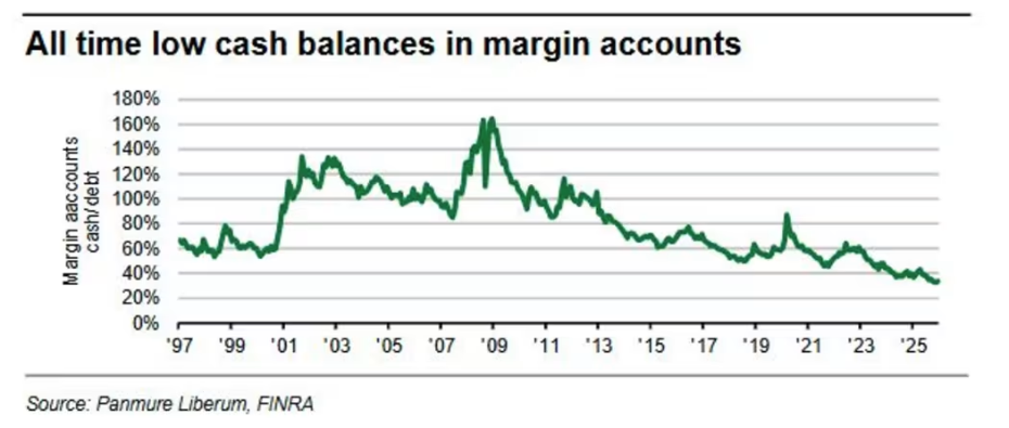 其下方圖表顯示,美國保證金賬戶的現(xiàn)金余額與保證金債務(wù)的比值已跌至歷史新低。