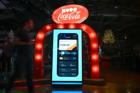 展示 Kontigo 加密貨幣應(yīng)用界面的大屏幕,余額顯示 5000 美元及交易記錄