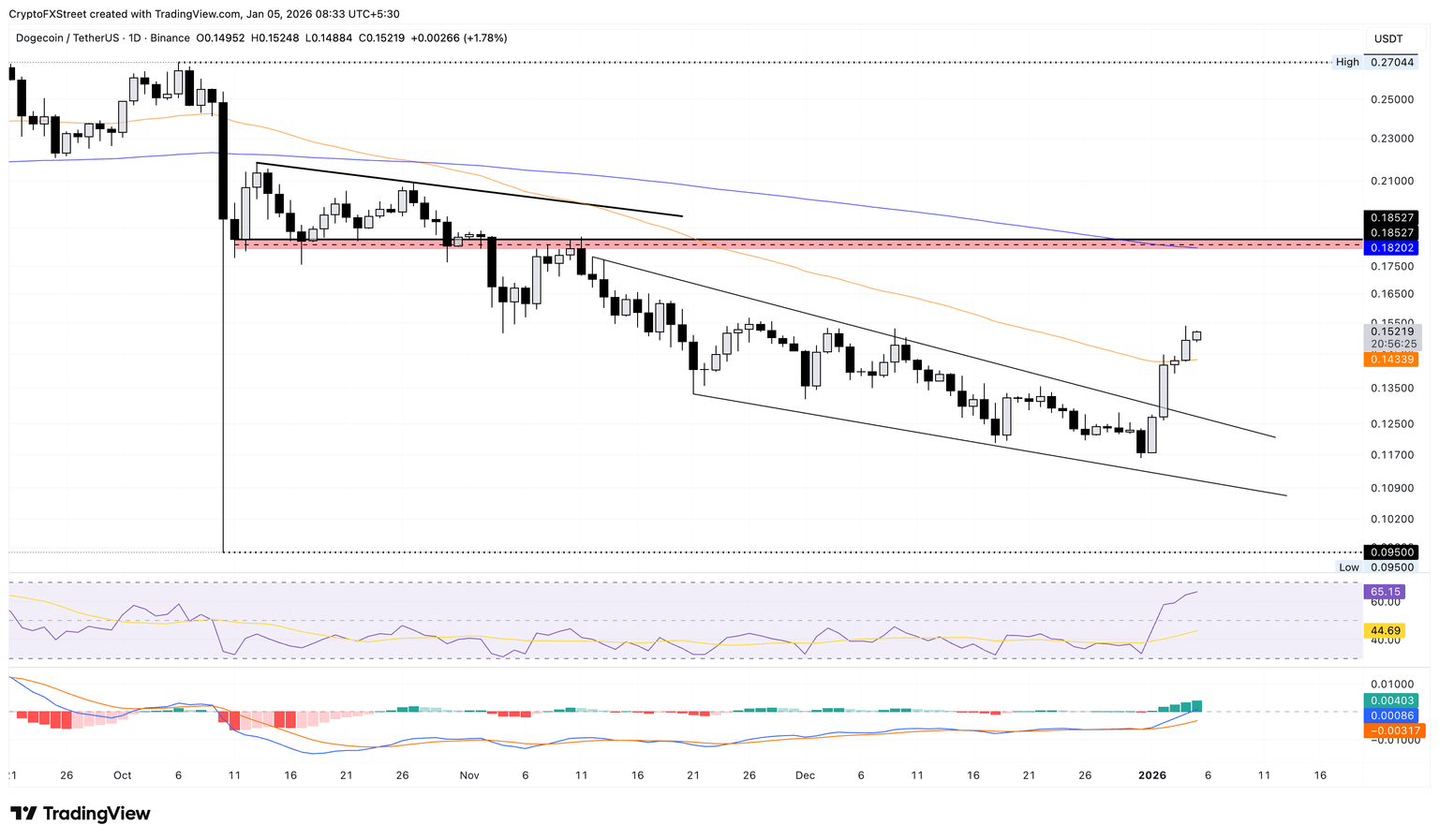 如果 DOGE 跌破 0.14399 美元,則可能抵消突破性反彈,從而可能面臨 0.13000 美元整數(shù)的風(fēng)險(xiǎn)。
