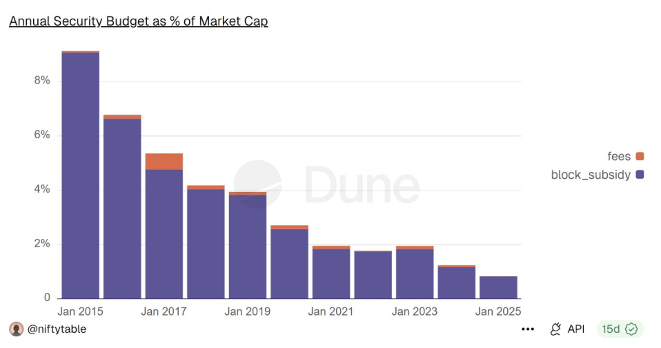比特幣安全預(yù)算占市值的百分比。來(lái)源:@Justin_Bons