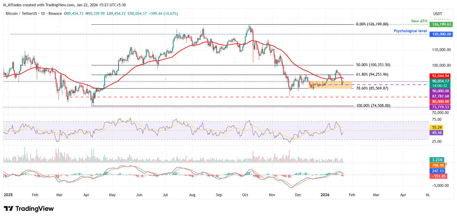 截至周四發(fā)稿時(shí),比特幣 (BTC) 價(jià)格延續(xù)了此前的反彈勢(shì)頭,突破 9 萬(wàn)美元大關(guān)。此前一天,比特幣價(jià)格在關(guān)鍵價(jià)位附近獲得支撐。美國(guó)總統(tǒng)特朗普周三在達(dá)沃斯發(fā)表講話,宣布取消對(duì)歐洲國(guó)家征收新關(guān)稅,此舉提振了市場(chǎng)風(fēng)險(xiǎn)偏好,也支撐了比特幣等風(fēng)險(xiǎn)資產(chǎn)的價(jià)格。然而,交易者仍需保持謹(jǐn)慎,因?yàn)楸忍貛努F(xiàn)貨交易所交易基金 (ETF) 的機(jī)構(gòu)需求正在減弱,周三超過(guò) 7 億美元的資金流出,令比特幣的強(qiáng)勁反彈勢(shì)頭略顯疲軟。