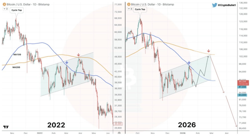 在他的技術(shù)分析中發(fā)布Crypto Bullet 在 X 網(wǎng)站上指出,比特幣目前正在重演 2022 年的走勢,這可能導(dǎo)致其價值下跌超過 20%。為了佐證其看跌觀點,該分析師展示了一張對比圖表,比較了比特幣在 2022-2023 年和 2025-2026 年的價格走勢,并著重強調(diào)了相似的技術(shù)形態(tài)、價格行為和移動平均線 (MA)。