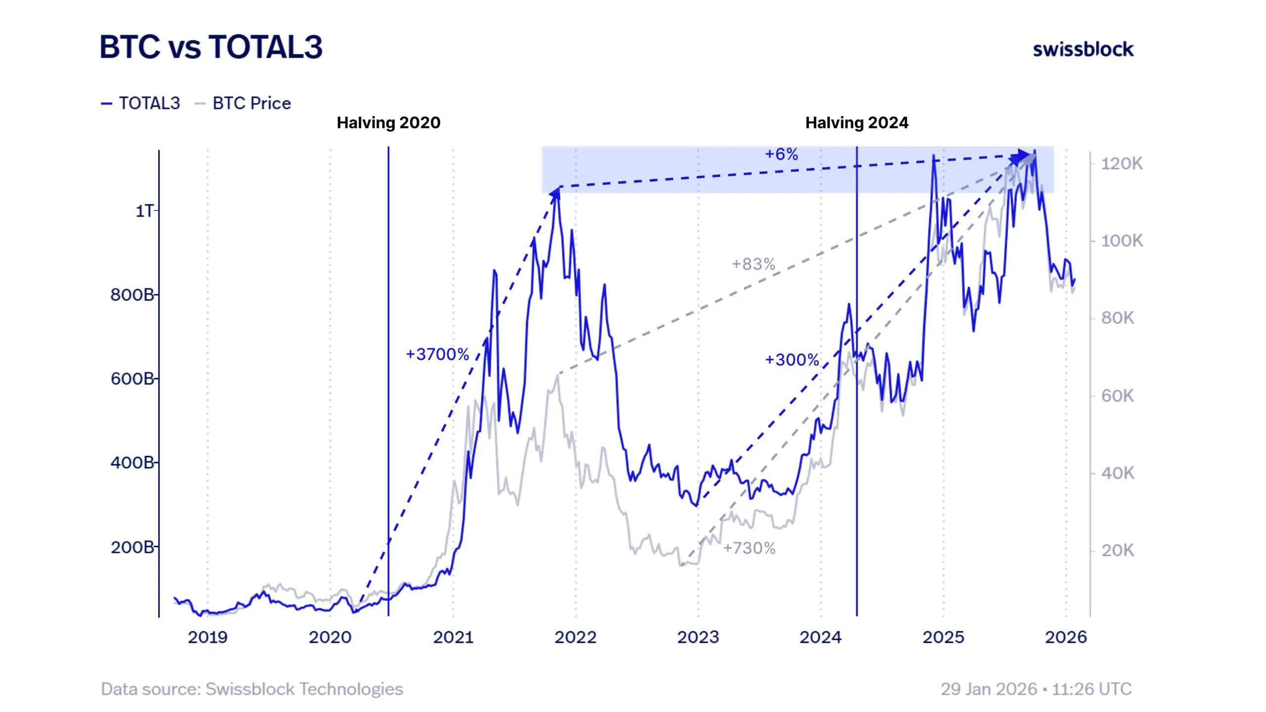 比特幣價(jià)格已較前一周期高點(diǎn)飆升約 83%,這一里程碑式的漲幅是其他加密貨幣(山寨幣)鮮有企及的。追蹤除比特幣和以太坊之外的加密貨幣市值的 TOTAL3 指數(shù),目前僅比前一峰值上漲約 6%。