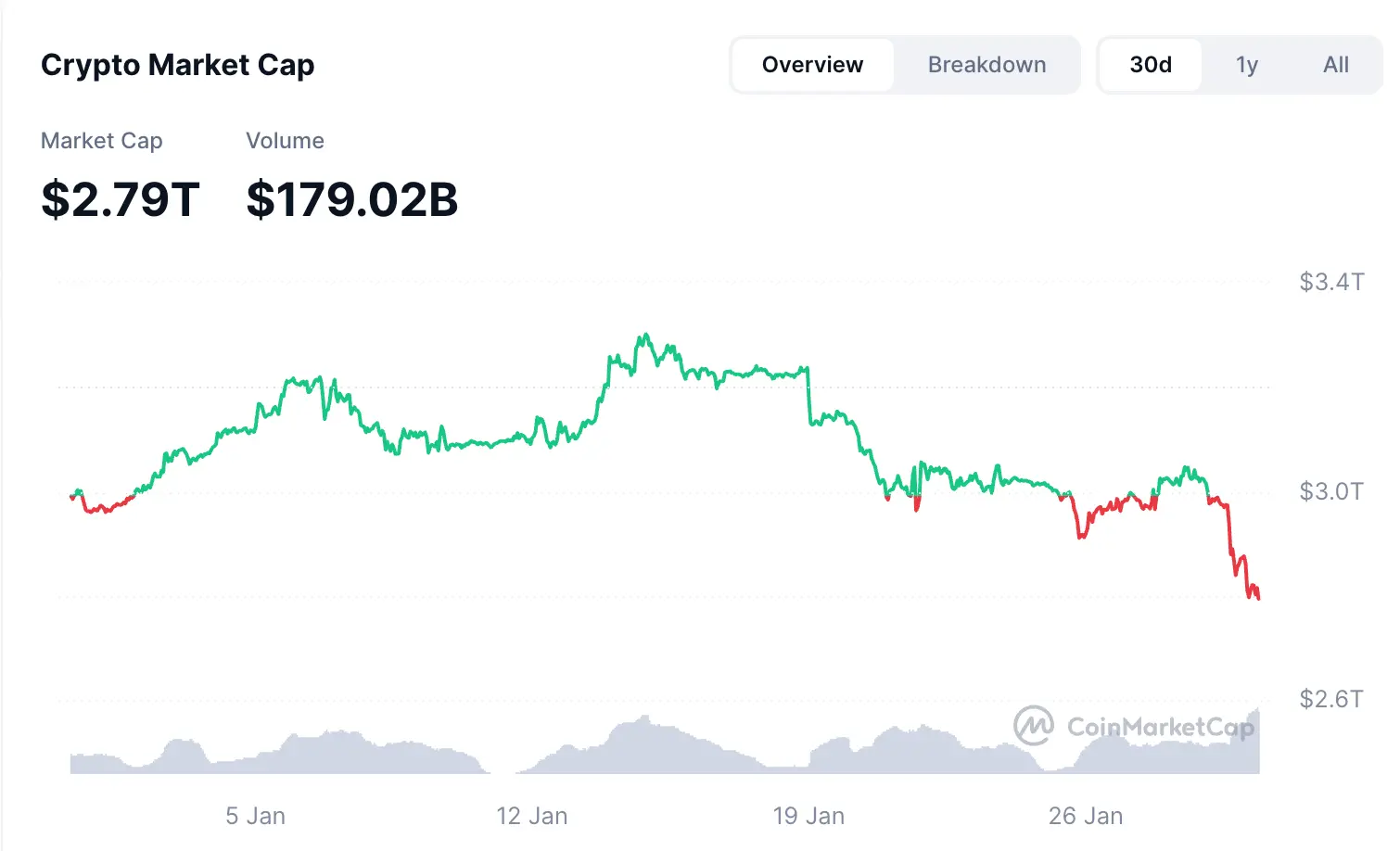 在主流幣種中,XRP 和 Solana 等熱門代幣同樣經(jīng)歷了類似的單日跌幅。整體而言,加密貨幣市場總市值整體下跌約 5%,目前降至 2.79 兆美元。