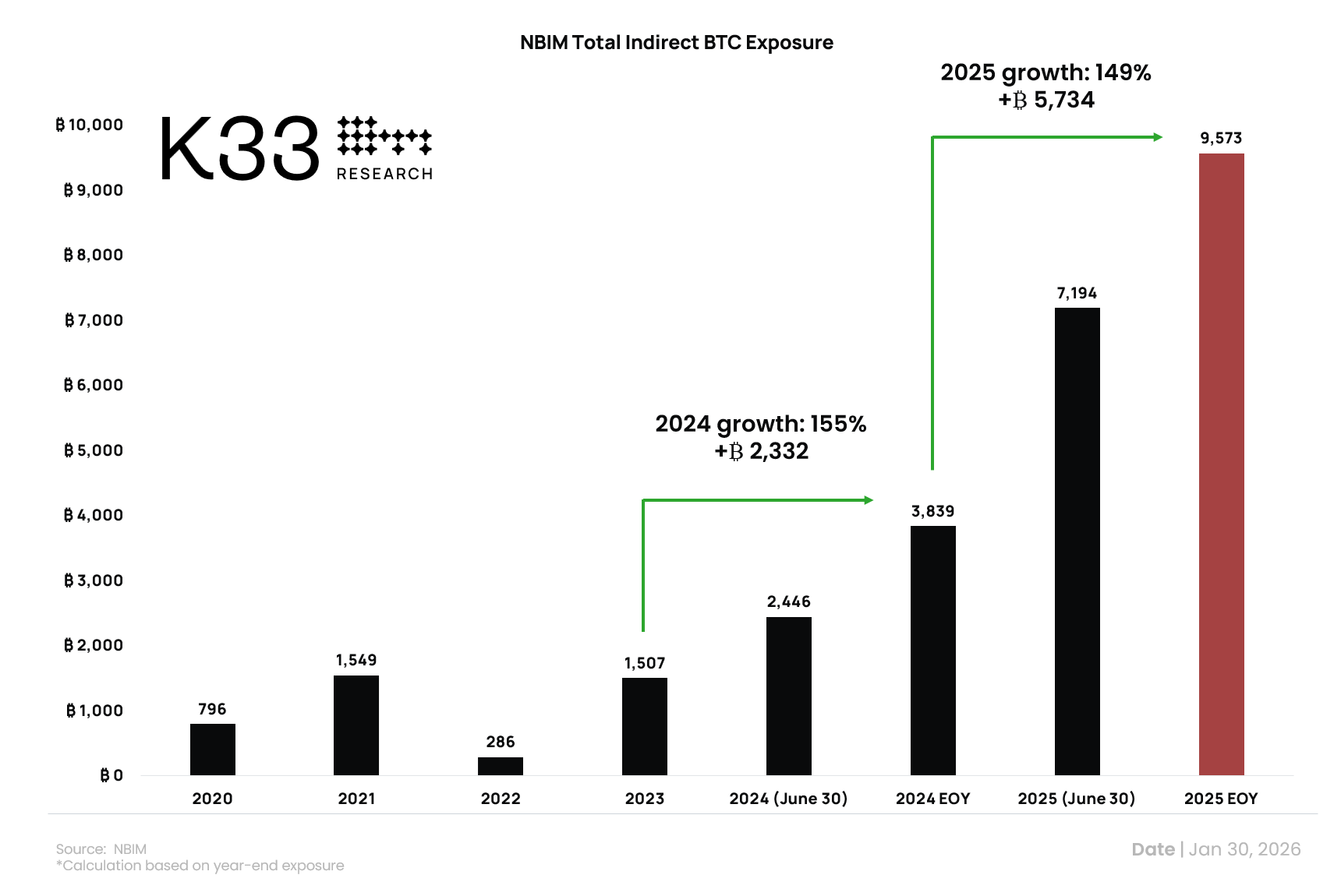 K33 的計(jì)算方法是:以 NBIM 持有的比特幣持有公司股份百分比乘以這些公司的比特幣庫(kù)存。