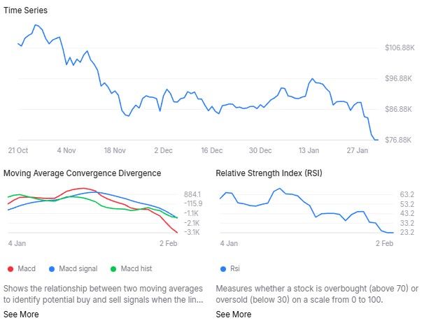 比特幣(比特幣受宏觀經(jīng)濟(jì)不利因素的影響,該股周一(2月2日)繼續(xù)下跌,交易價(jià)格低于77000美元水平。機(jī)構(gòu)資金外流以及強(qiáng)制清算。