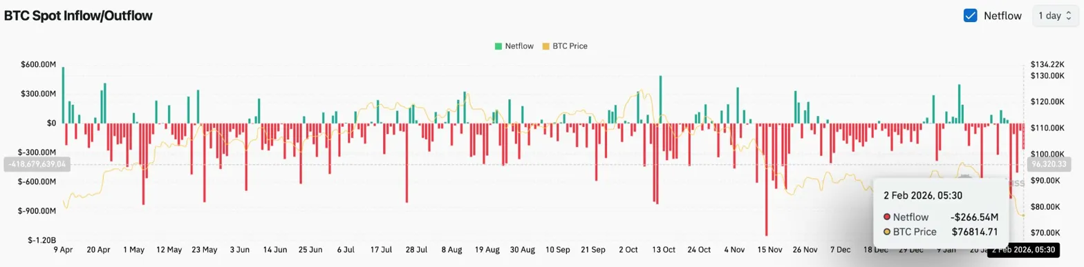 Coinglass數(shù)據(jù)顯示,2月2日現(xiàn)貨資金流出高達(dá)2.6654億美元,這是自去年11月調(diào)整以來(lái)單日最大資金流出之一。如此大規(guī)模的拋售反映的是恐慌情緒,而非有序的倉(cāng)位調(diào)整。