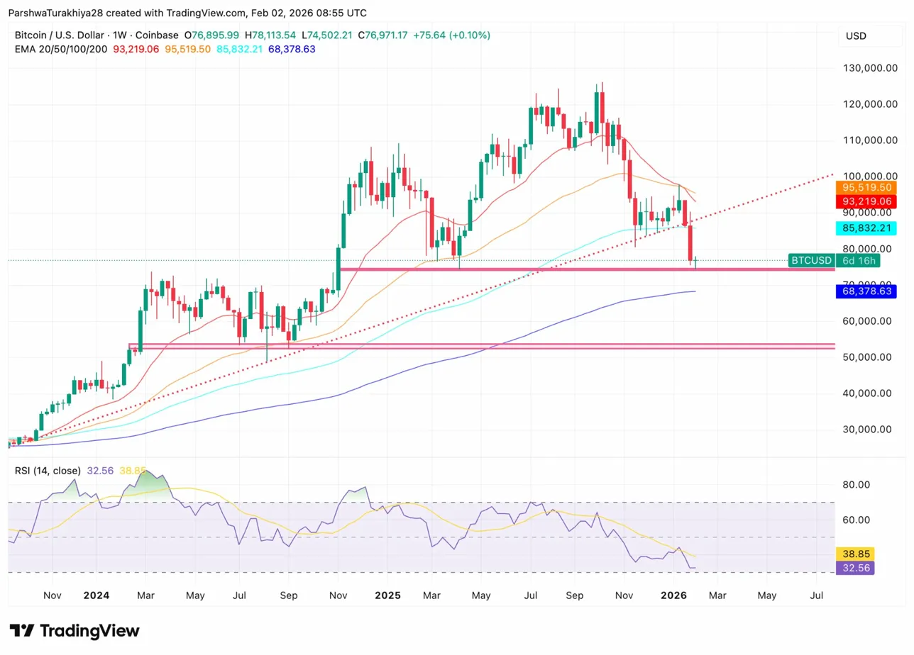 74,000 美元至 78,000 美元區(qū)域是 2024 年盤整期間的主要水平支撐位。如果周線收盤價(jià)跌破該水平,則宏觀結(jié)構(gòu)將從回調(diào)轉(zhuǎn)向潛在的趨勢(shì)反轉(zhuǎn)。