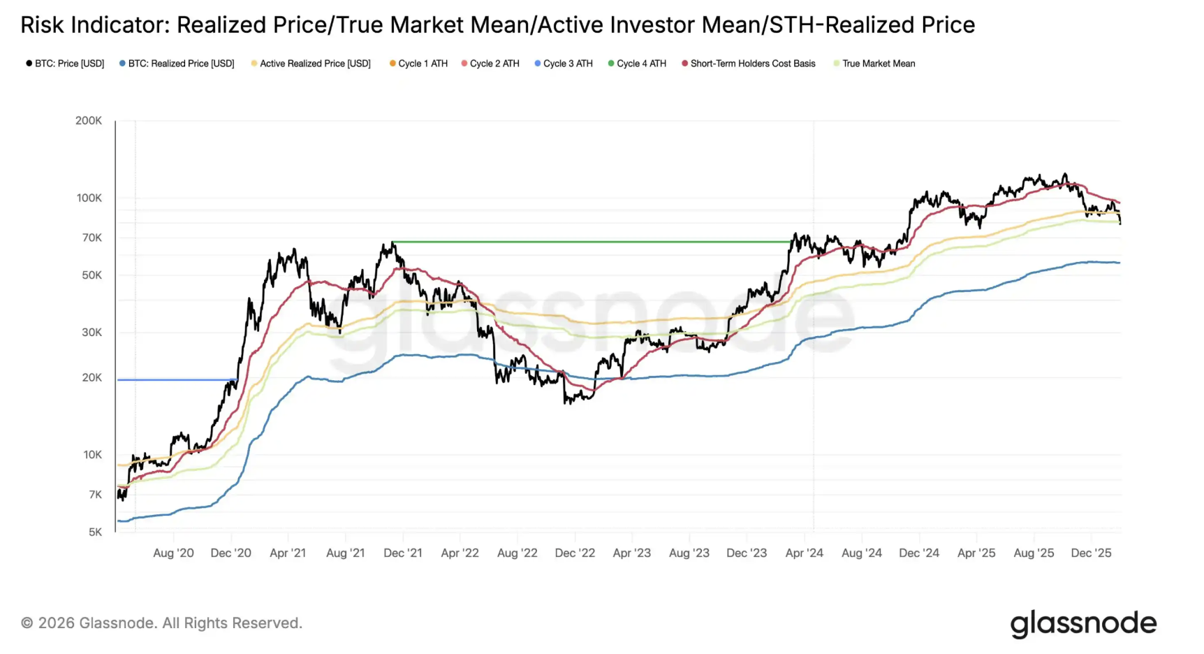 比特幣跌破 7.8 萬美元,glassnode 更新比特幣鏈上關(guān)鍵價格分布如下:STH(短期持有者)成本基礎(chǔ),反映最近幾個月新進場買家 / 交易者的平均持倉價格是 9.54 萬美元。
