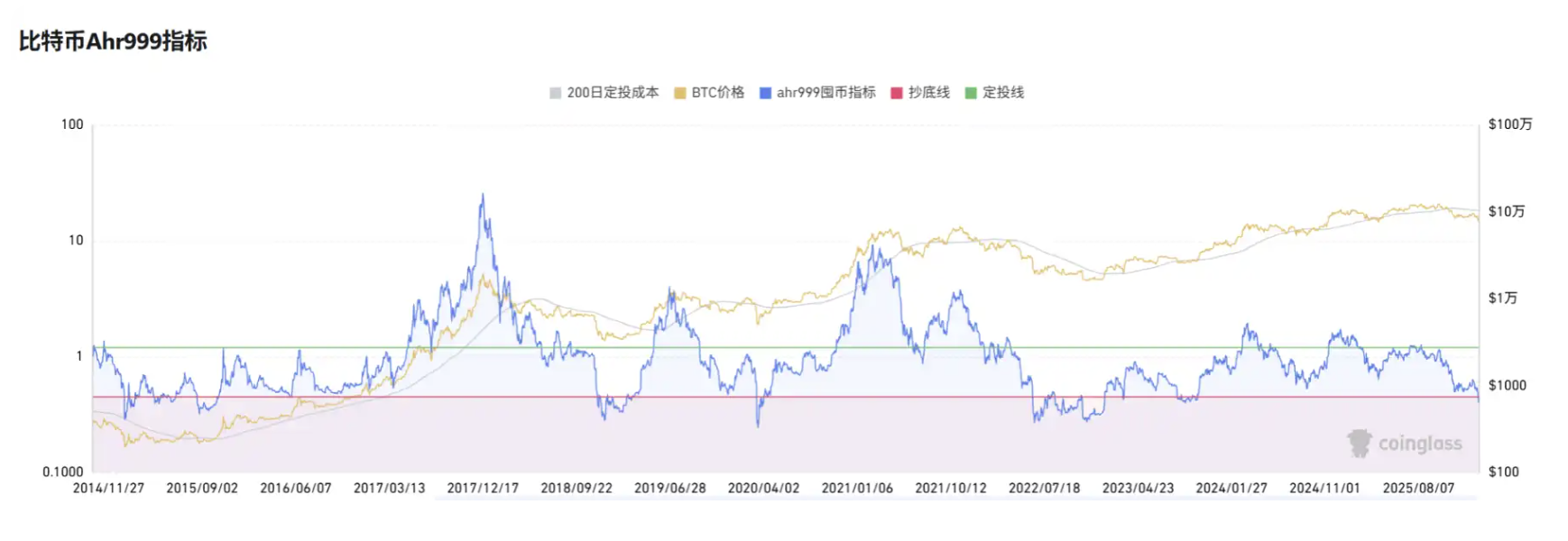 ahr999 指標多年前由微博用戶 ahr999 發(fā)明,用于評估 BTC 短期回報與價格偏差。該指標計算公式為(當前價格 / 200 日定投成本)×(當前價格 / 指數(shù)增長估值),其中指數(shù)增長估值基于歷史價格和區(qū)塊高度的擬合曲線,代表長期「公允價值」。歷史經(jīng)驗顯示:ahr999 < 0.45 為低價買入?yún)^(qū);0.45-1.2 適合定投;>1.2 為高價區(qū)。
