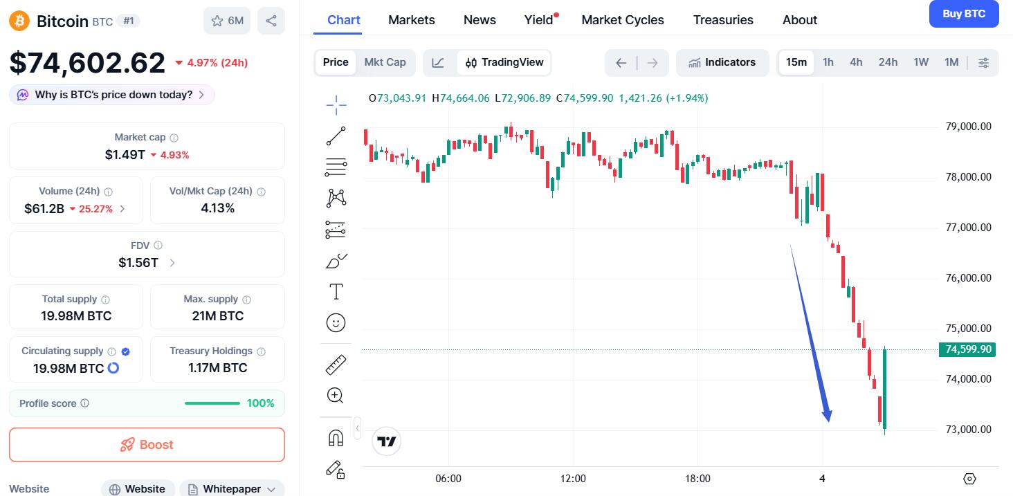 比特幣周二跌破了2025年4月7日跌破7.45萬美元所創(chuàng)的年內(nèi)低點,當(dāng)時特朗普公布的所謂對等關(guān)稅計劃沖擊了全球金融市場。