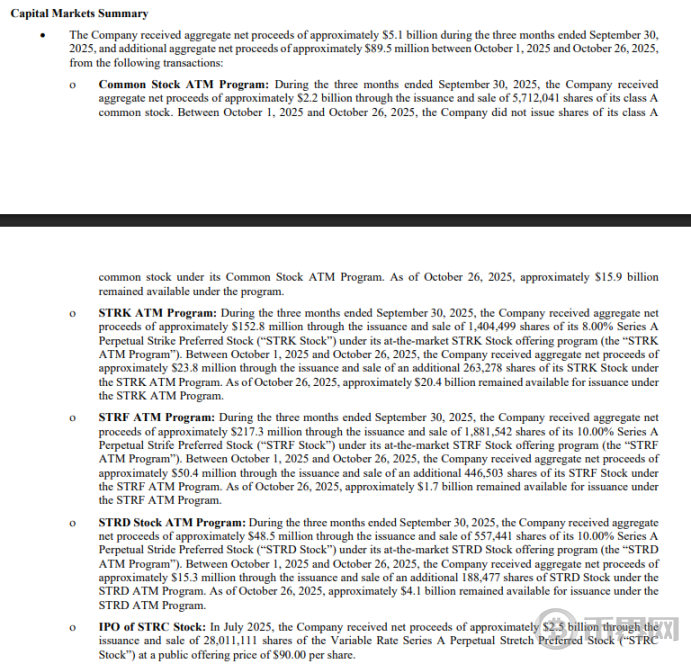 而實(shí)際上在 2025 年第三季度的財(cái)報(bào)表明,截止到 2025 年 10 月 26 日 MSTR 通過(guò)多個(gè) ATM 程序的剩余發(fā)行額度合計(jì)約 421 億美元,說(shuō)人話就是 MSTR 最大可以買價(jià)值 421 億美元的 Bitcoin 。