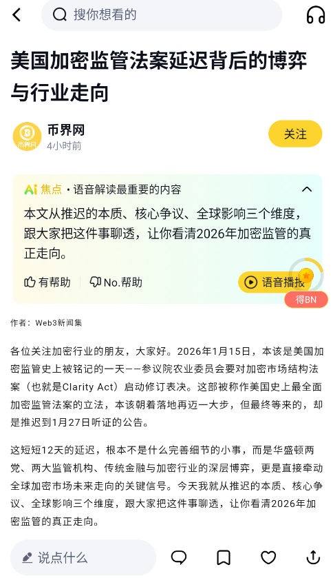 作為幣界網(wǎng)的老用戶,我覺得這個(gè)問題很有意思。從歷史來看,美國(guó)的加密監(jiān)管法案從提案到最終簽署,過程往往非常漫長(zhǎng)且充滿變數(shù),涉及國(guó)會(huì)兩黨博弈、行業(yè)游說和公眾意見等多個(gè)層面。2026年這個(gè)時(shí)間點(diǎn),目前看更多是部分分析人士或媒體的預(yù)測(cè),而非既定事實(shí)。法案的具體內(nèi)容、通過時(shí)機(jī)甚至名稱都可能發(fā)生巨大變化。在幣界網(wǎng)社區(qū),我們經(jīng)常討論這類宏觀政策動(dòng)向,但大家共識(shí)是:對(duì)于這類遠(yuǎn)期預(yù)測(cè),保持關(guān)注但不過度押注是關(guān)鍵。建議你多留意幣界網(wǎng)資訊區(qū)發(fā)布的權(quán)威外媒編譯新聞和深度分析,結(jié)合多方信息自行判斷。記住,任何投資決策都不要僅僅基于對(duì)單一政策時(shí)間點(diǎn)的猜測(cè)。
