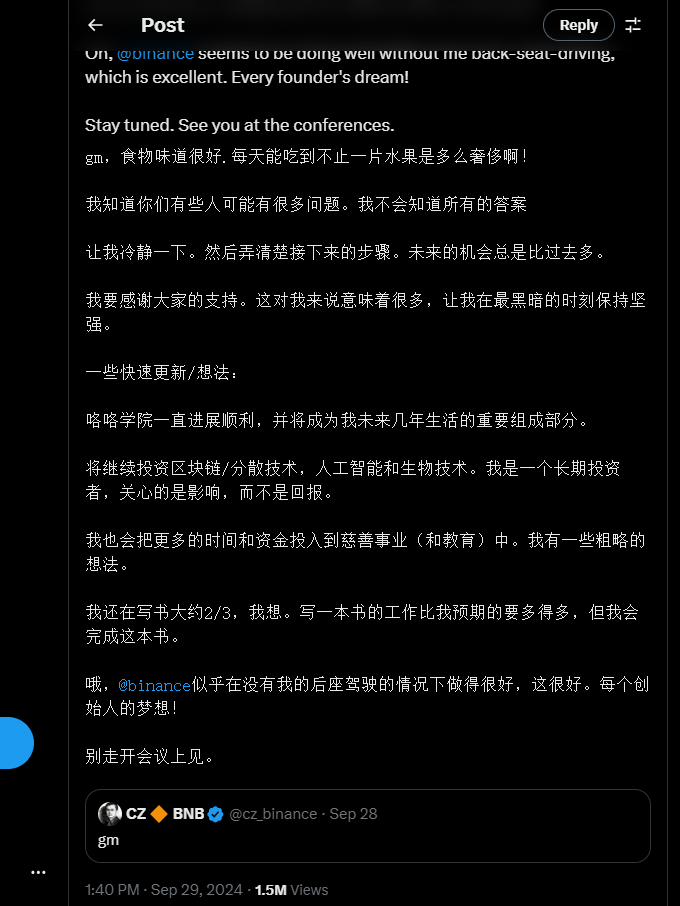 就在FTX賠償計劃再次推遲的消息傳出之際,趙長鵬(CZ)因違反監(jiān)管規(guī)定而短暫服刑后獲釋。他的釋放在整個加密社區(qū)引發(fā)了廣泛討論。作為一位備受關(guān)注的人物,同時也是SBF的前競爭對手,CZ擁有大量追隨者,他的言論極具影響力。獲釋后,他發(fā)表了一篇長文,闡述了自己的狀態(tài),和在美國監(jiān)獄里吃到一篇水果是多么奢侈,并再次強(qiáng)調(diào)了自己是一個長期投資者。