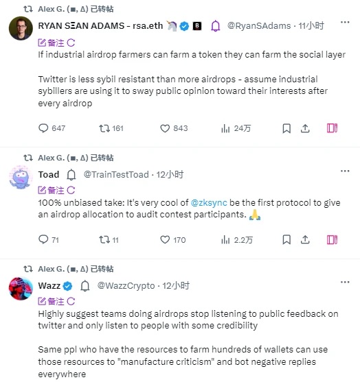 然而,與 zkSwap 的情況一致,官方賬號并未對質疑做出任何回應,只有 ZKsync 的 CEO Alex 在不斷地轉發(fā)此次空投的正面言論。