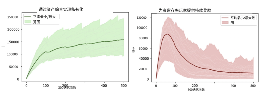 在資產(chǎn)合成實(shí)現(xiàn)私有化模型(左圖)中,我們觀察到隨著迭代次數(shù)的增加,玩家總貢獻(xiàn)值呈現(xiàn)出持續(xù)上升的趨勢(shì),表明該模型在維持玩家參與度和推動(dòng)長(zhǎng)期價(jià)值增長(zhǎng)方面效果顯著。相反,高留存率玩家持續(xù)獎(jiǎng)勵(lì)模型(右圖)最初表現(xiàn)出玩家貢獻(xiàn)的急劇上升,然后顯著下降。盡管該模型在早期階段表現(xiàn)出高玩家貢獻(xiàn),但后續(xù)迭代中觀察到的下降表明在維持長(zhǎng)期玩家參與度方面存在挑戰(zhàn)。