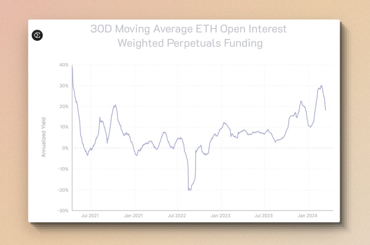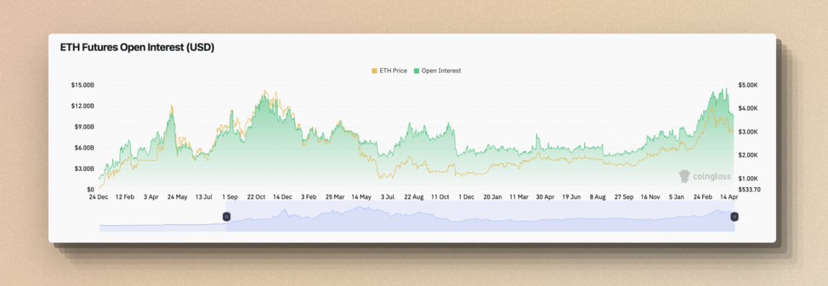 Open Interest 指的是在交易所中未平倉合約的總數(shù)。在這里,它特指 ETH 在中心化交易所中的永續(xù)合約未平倉頭寸的總價(jià)值。目前這個(gè)數(shù)字約為 120 億美元(2024 年 4 月)。這個(gè)數(shù)字反映了市場參與者對 ETH 的當(dāng)前持倉水平。