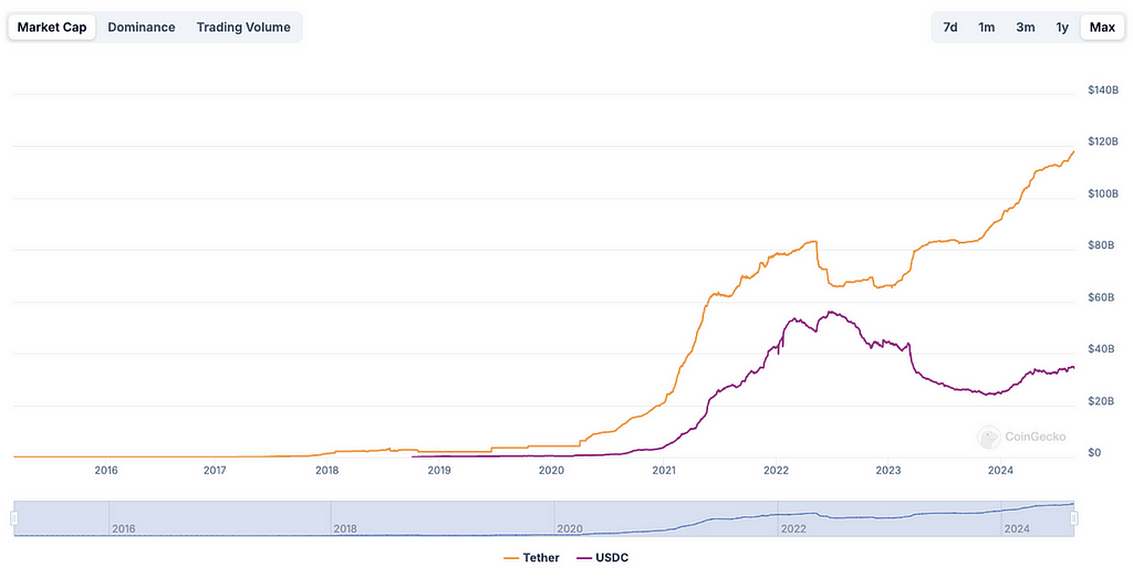 自 2015 年以來,穩(wěn)定幣呈指數(shù)級(jí)增長,為 2 萬億市值的加密市場(chǎng)提供了有效的支付和結(jié)算。目前穩(wěn)定幣整體市值突破 $171B,Tether USDT 市值在 2022 年突破 $83B 的基礎(chǔ)上進(jìn)一步增長到目前的 $117.9B,增幅高達(dá) 42%,顯示了加密市場(chǎng)對(duì)穩(wěn)定幣需求量的劇增。