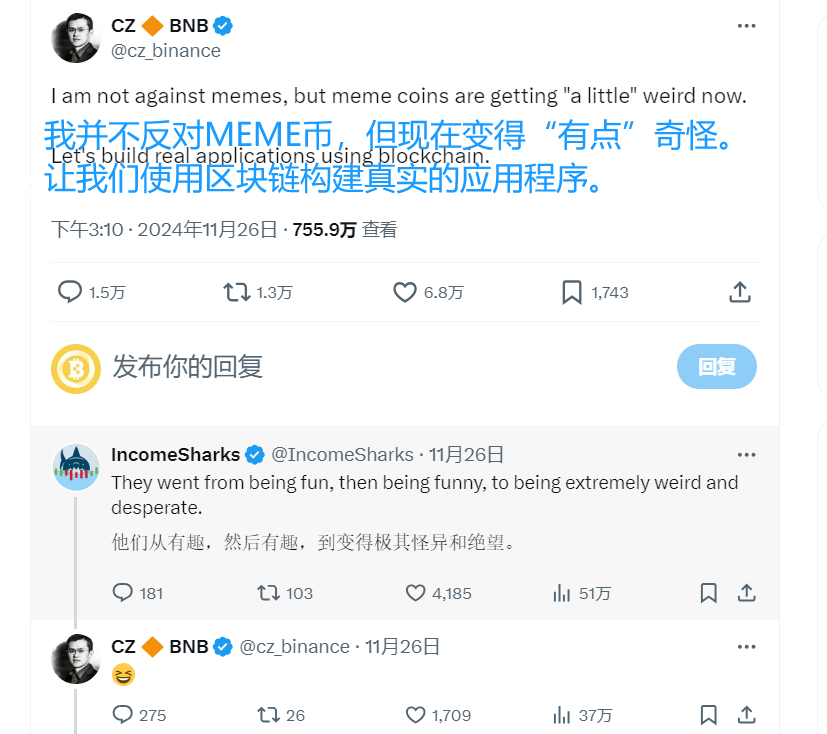 MEME 幣已從娛樂性質(zhì)發(fā)展為重要的市場力量,在狗狗幣(DOGE)和失幣(SHIB)帶動下,這類代幣的病毒式傳播推動估值飆升。然而,卻引發(fā)了加密行業(yè)領(lǐng)袖趙長鵬的擔(dān)憂。