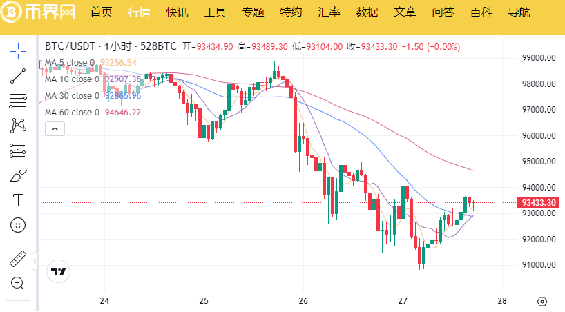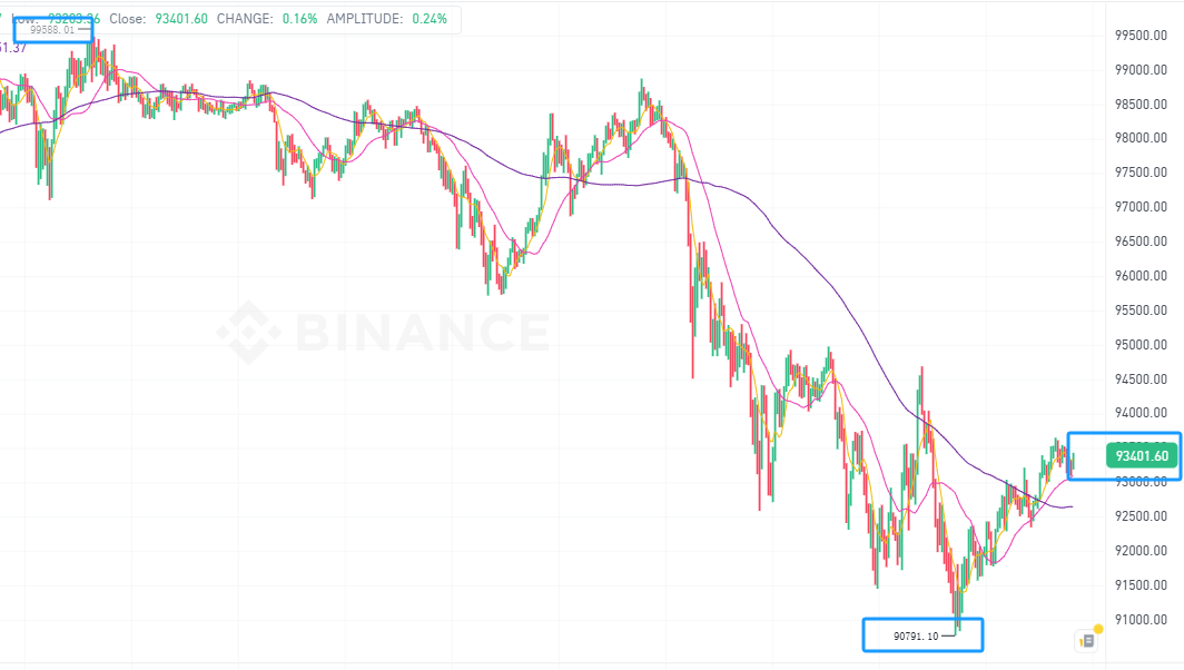 比特幣在觸及 99,588 美元后下跌 7% 至 90,791 美元,目前交易價格在 93,400 美元附近,雖顯現(xiàn)復(fù)蘇跡象,但仍未恢復(fù)峰值水平。